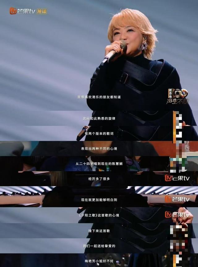 这是陈慧娴第一次演唱梅艳芳的版本,不禁惹的台下的主持人何炅也抑制不住的擦拭眼泪,后台的李宇春,陈小春等歌手也是情难自禁,这不仅是一场经典的再现,更是一场跨越35年的和解,多年的人生经历,也让陈慧琳道尽了《夕阳之歌》里的情感和对人生淡然的释怀